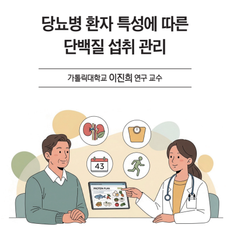 당뇨병 환자를 상담하다 보면, “혈당관리를 위해 고기를 줄여야 하나요?”, “살이 빠지는데, 단백질을 더 먹어도 되나 요?”라는 질문을 받을 때가 있습니다. 둘 다 흔한 질문이지만, 이 각각의 질문에 대해 모든 환자에게 같은 답을 줄 수 는 없습니다. 최근 발표된 미국당뇨병협회 와 대한당뇨병학회 진료 지침이 공통으로 강조하는 바는 분명합니다. “당 뇨병 환자에게 탄수화물, 단백질, 지방의 이상적인 공통 비율은 없으며, 단백질 섭취 역시 환자의 연령, 체중 변화, 기 능 상태, 신장 기능, 치료 목표에 따라 개별화해야 한다.”는 점