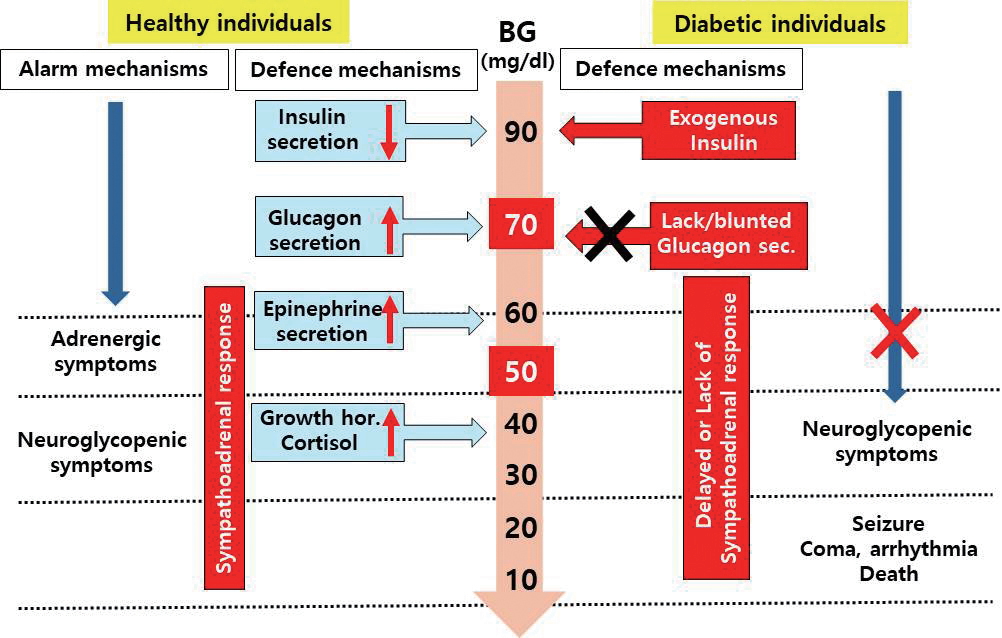 100여년전 최초로 인슐린 치료를 시작하였을 때부터 저 혈당 증상이 관찰되었으며9), 이 증상은 마치 에피네프린 주 사를 맞은 것과 유사하다고 하였다10). 당뇨병 환자에서 저 혈당이 빈번하고 심한 이유와 병태생리는 1980년대 이후 혈 당측정이 간편해지고 관련 호르몬을 측정하는 것이 가능해 지면서 밝혀지게 되었다.