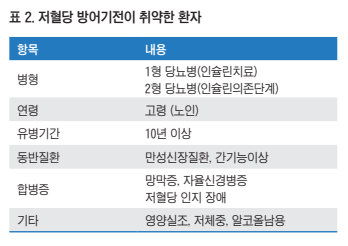 당뇨병 환자를 진료할 때 담당의사는 혈당조절이 잘 되는 지와 동시에 저혈당이 있었는지를 살펴보아야 한다. 인슐린 주사 치료를 받는 1형 당뇨병 환자, 인슐린의존단계에 있는 2형 당뇨병 환자는 저혈당 방어기전기능이 감소 또는 결핍 되어 있어서 저혈당에 매우 취약하다<표 2>. 연속혈당측정 기록의 분석에 의하면 저혈당을 인지하지 못하고 지나가는 경우가 1형 당뇨병에서는 약 60%, 인슐린 주사를 맞는 2형 당뇨병에서는 약 40%에 이른다고 한다 16,17). 노인 또한 저 혈당에 취약한데 이는 신장기능저하, 다약제복용, 인지능력 저하 및 저혈당증상역치 감소가 잘 동반되기 때문이다 18).