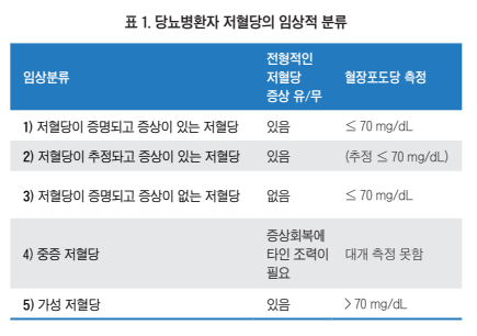 일반적인 저혈당의 정의 또는 기준은 70mg/dl 이하인데, 실제 당뇨병 환자 저혈당 증상이 나타나는 혈당역치 가 다소 다르고 생리반응에도 차이가 있어 임상 양상이 조금씩 다르다. 따라서 당뇨병 환자의 저혈당을 분류하는 것이 필요한 데 미국당뇨병학회(ADA)와 내분비학회(Endocrine Society)에 서는 저혈당을 다음의 5가지 형태로 분류하고 있다5).<표 1>