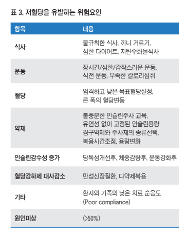 환자에서 저혈당이 있었다면 특징을 잘 파악하여야 한다. 저혈당을 인지하였는지? 증상을 느꼈었는지? 정도는 얼마 나 심각했는지? 반복되는 것인지? 야간/식전/운동전후 등 언제 발생했는지? 혈당측정치는 얼마였는지? 환자의 대처 는 어떠하였는지? 관련된 요인들은 무엇인지? 등등을 탐문 수사에 가까울 정도로 파악하여 유발요인을 알아 내도록 한 다<표 3>.