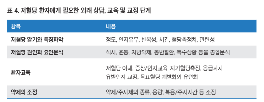 저혈당과 관련된 특정 요인이 파악되었다면, 환자에게 설 명하고 이해시키며 이를 교정하는 방법을 같이 찾도록 한 다. 또한 저혈당 발생시 대처하는 요령과 처치 등을 교육하 여 심리적 안정을 주도록 한다. 심층분석에도 불구하고 실 제 임상에서 저혈당의 원인을 찾지 못하는 경우가 많지만 환자가 인슐린 주사제를 사용하고 있다면 주사제의 종류, 용량, 주사 시간 등을 환자의 식사관리, 운동요법 및 특수 상 황에 맞추어 조정하도록 하며 유연성을 가지도록 교육하며 식사와 운동요법에 변화를 주어서 문제점을 개선하는 계획 을 수립하도록 한다<표 4>.