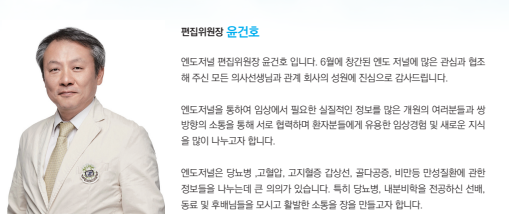 엔도저널에 동참해주신 고문님 부산시 김용기 교수님과 서울시 이현철교수님께 진심으로 다시 한번 감사드리고, 동참해주신 모든 편집위분들에게도 존경과 감사의 말음을 전합니다. 저희는 본 저널이 지역사회 일차의료현장에서 환자 치료와 관리에 유용한 정보를 함께 나누고 서로에게 힘이되는 소통의 장이 될 수 있도록 노력하겠습니다. 많은 분들의 참여와 아낌없는 성원을 부탁드립니다.