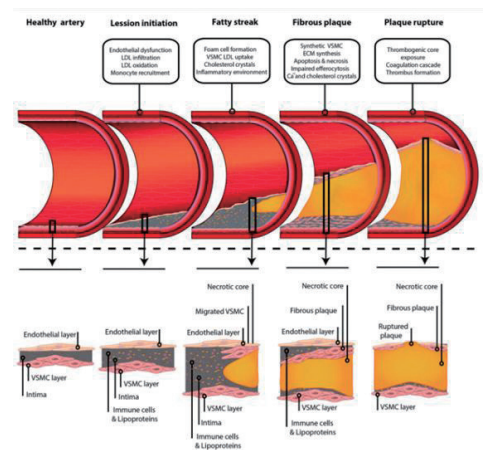 질병이 진행됨에 따라 평활근 세포는 배질에서 혈관 내 막으로 이동하여 증식하며 세포외 기질 성분을 분비합니다. 이로 인해 fatty streak 위에 섬유성 캡이 형성되고 플라크 가 성숙 하게 된다 . 고혈당은 최종당화산물(AGE) 형성하 고 수용체와 상호작용하여 산화 스트레스, 염증, 혈관 석회 화를 촉진함으로써 이 과정을 강화하게 된다(5). 이후 플라 크가 파열되면 혈전형성이 발생하게되며 혈관 내강의 좁아 짐과 혈전성 사건으로 치명적인 심혈관질환의 발생을 초래 한다<그림1>.