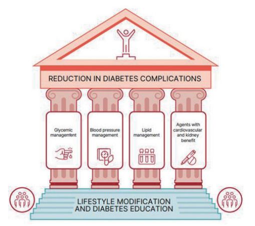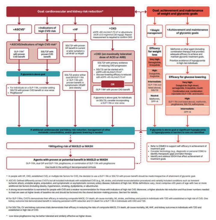 최근의 당뇨치료의 패러다임변화는 단순히 당뇨환자에 서 혈당조절을 목표로 하는게 아니라 환자 개개인의 특성 과 동반된 질환을 고려해서 개별화된 치료를 계획해야하고 그에 맞는 약물치료를 해야한다. 당뇨환자 사망률에서 가 장 중요한 심혈관계 질환의 근본원인은 혈관의 죽상경화이 다. 따라서 심혈관질환이 있는 당뇨환자에서는 여러 대규모 임상시험에서 죽상경화 억제효과가 입증된 GLP-1 RA, 와 SGLT2 inhibitor를 국내외 가이드라인에서 1차약으로 권고 되고 있다.