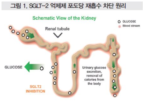 신장의 사구체 여과 과정에서 포도당의 재흡수를 담당하 는 SGLT-2 단백질의 작용을 선택적으로 억제, 포도당이 세 뇨관에 재흡수 되는 것을 차단하고 체내에 남은 포도당을 소변으로 배출시켜 혈당을 조절한다.