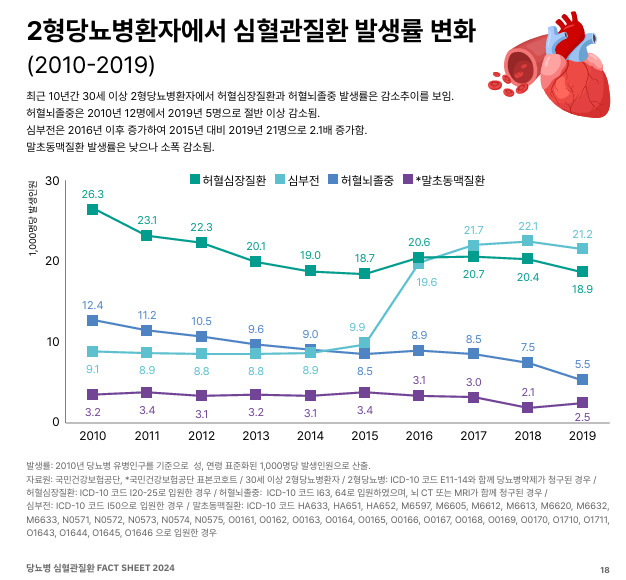 심혈관 질환은 당뇨병 환자에서 매우 흔하며, 당뇨병 유형 과 관계없이 비당뇨병 환자보다 이환율과 사망률이 2배에 서 4배 높은 것으로 추정된다(3).