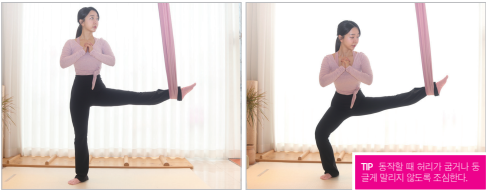 준비 양손으로 해먹을 단단하게 감아쥔 뒤 양발을 앞뒤로 둔다. 앞다리는 살짝 굽히고 뒷다리는 쭉 뻗으며 발끝을 세운다.