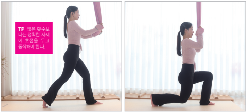 동작 앞쪽 무릎은 90도로 굽히고 뒤쪽 무릎은 바닥에 가깝게 내린 뒤 준비자세로 돌아온다. 반대쪽도 동일하게 실시한다.