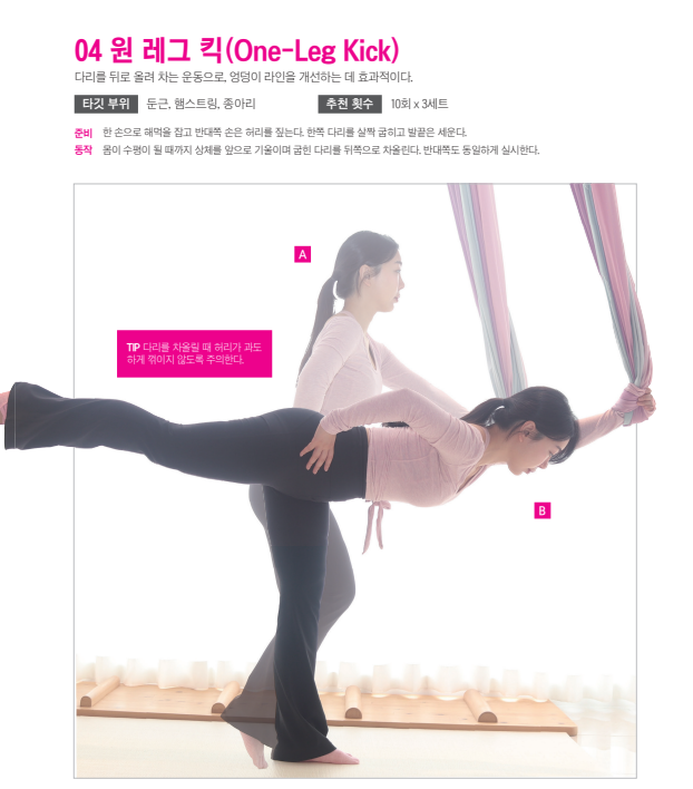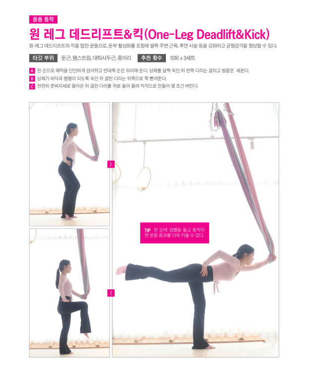 준비 한 손으로 해먹을 감아쥐고 반대쪽 손은 허리에 둔다. 상체를 앞으로 살짝 숙이고, 한쪽 다리는 살짝 굽힌 뒤 발 끝을 세운다. 동작 상체를 바닥과 평행이 될 때까지 앞으로 숙이고 엉덩이 근육을 이용해 준비 자세로 돌아온다.