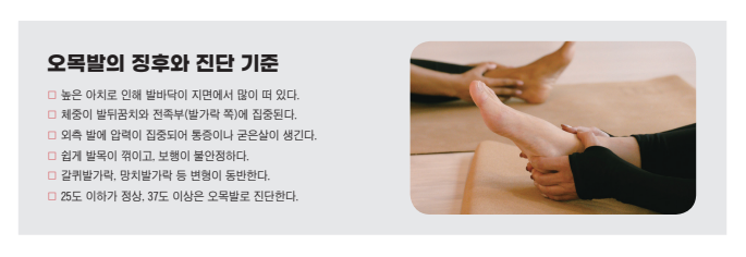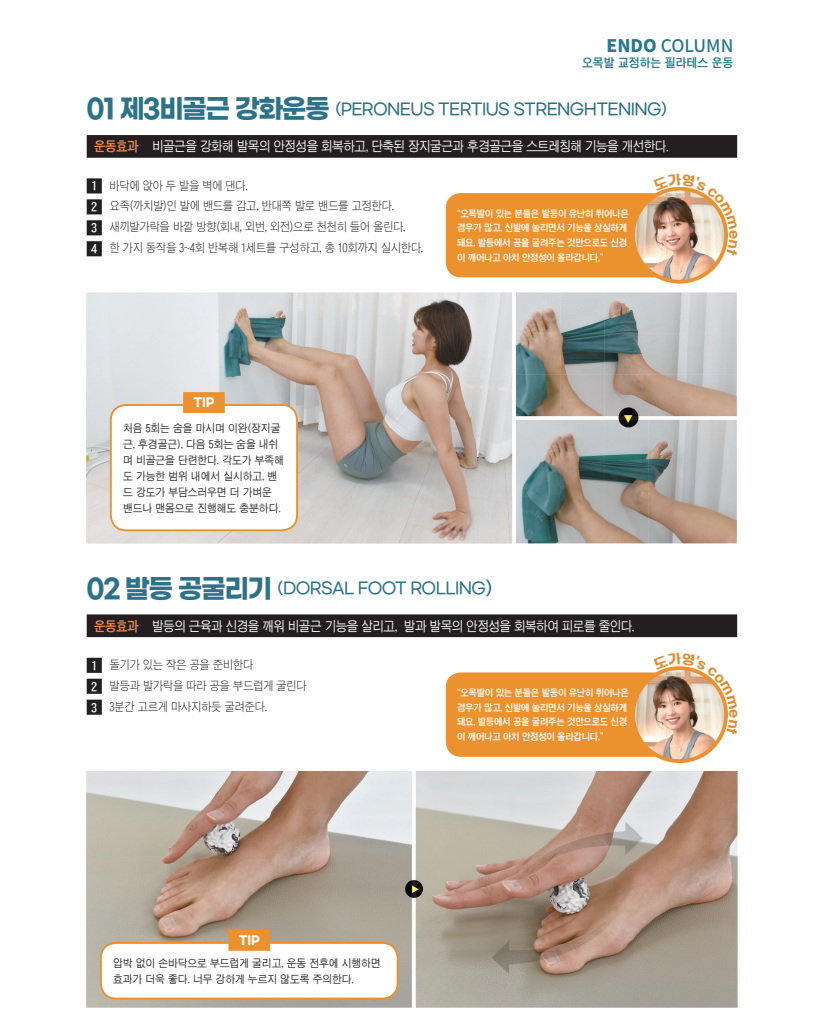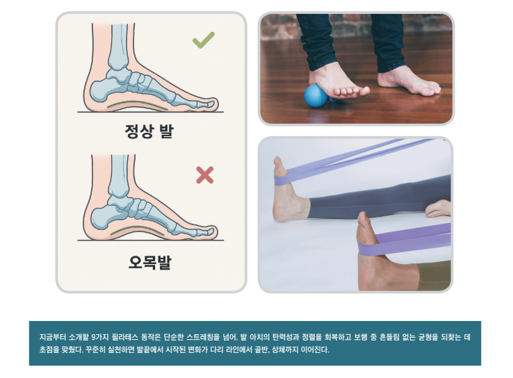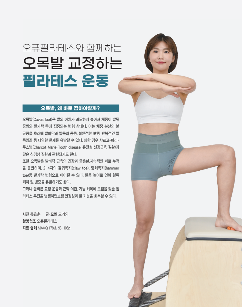 필라테스 운동으로 무엇이 달라질까?오목발은 단순한 발의 구조 이상에 그치지 않는다. 문제는 체중이 한쪽으로 쏠리며 생기는 체형의 전반적 불균형이다. 정상적인 보행 리듬이 무너지 고, 발목과 무릎, 고관절의 정렬이 흐트러지면 전신에 피로도와 통증이 누적되기 시작한다.이때 필요한 것이 기능 회복을 중심으로 한 필라테스 운동이다. 발의 구조적 특징을 이해하고, 무너진 근육 협응을 다시 설계하는 움직임 기반의 접근 이 필수적이다.