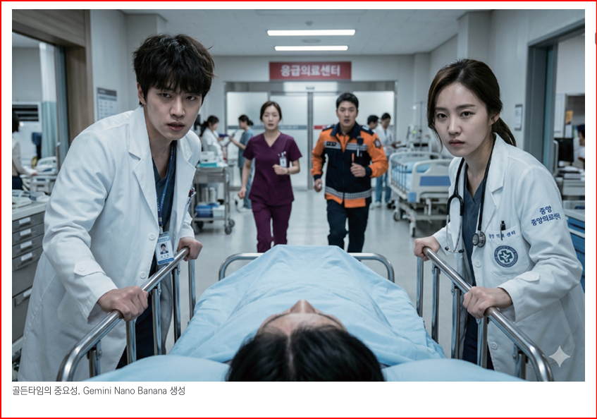 골든타임의 대표적 사례로 제시된 이들 네 가지 상황의 시간창은 서로 다르다. 심정지는 수분, 뇌졸중은 수십 분에서 수 시간, 심근경색은 수 시간 단위이되 초기 수 시간의 가치가 압도적으로 크며, 중증외상은 손상 기전 과 출혈 정도에 따라 분 단위로 악화될 수도 있다. 그러나 공통점은 시간이 흐를수록 장기 기능을 빼앗긴다는 것이다. 골든타임은 "몇 분 안에 병원에 가라"는 단 일한 구호가 아니라, 질환마다 다른 속도로 진행하는 손 상이 아직 되돌릴 수 있는 상태로 남아 있는 시간이다.