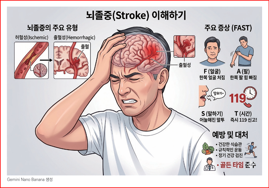 뇌졸중과 골든타임 다음은 뇌졸중이다. 뇌졸중은 출혈성 뇌졸중과 뇌혈 관이 막힌 허혈성 뇌졸중이 있고, 특히 급성 허혈성 뇌 졸중에서는 골든타임이 정립되어 있다. 혈관이 막히 면 혈류가 끊긴 부위의 중심부는 빠르게 회복되지 않 는 손상이 진행하고, 그 주변에는 아직 구조적으로는 살아 있으나 기능이 억제된 허혈성 반음영(Ischemic penumbra)이 형성된다.