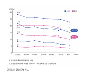 반면 국민건강영양조사 결과에서 근감소증 유병률은 남성 6.6%, 여성 9.2%로 여성이 더 높았다. 특히 소득 수준이 낮은 집단에서 유병률이 더 높은 것으로 나타 난다.
