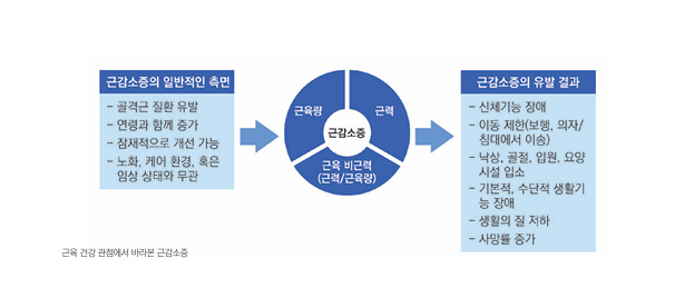 일반적으로 근육은 40세 이후부터 매년 0.5~1%씩 서서히 감소하지만, 그보다 더 큰 문제는 이에 따른 근력 저하 즉, 근감소증이다. 근감소증은 앞서 말한 것처럼 노쇠, 낙상 및 골절, 인지 기능 저하, 보행 장애라는 악 순환을 가져오는 핵심 요인이므로 근육 건강이 노년의 건강을 좌우한다고 해도 과언이 아니다.