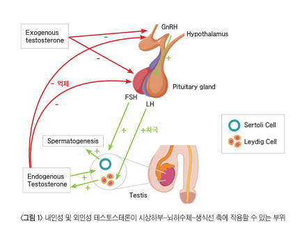테스토스테론을 투여하면 음성 피드백 기전을 통해 시상하부 GnRH, LH, FSH 생성을 억제하여 남 성호르몬과 정자 형성이 저하된다. 3~4개월 사용후에는 고 환 위축과 정자 생성이 감소하여 희소/무정자증도 유발한 다. 테스토스테론 치료 중단 후 정자 생성 회복은 테스토스 테론 용량, 투여 기간, 개개인의 생식 능력 상태에 따라 다르 다. 271명의 남성을 대상으로 한 연구에서 정자 수가 2천만 개 이상으로 회복되는 데 걸린 3~4개월이었고, 6~7개월 만 에 정상 수준으로 회복된 남성은 46%에 불과했다.